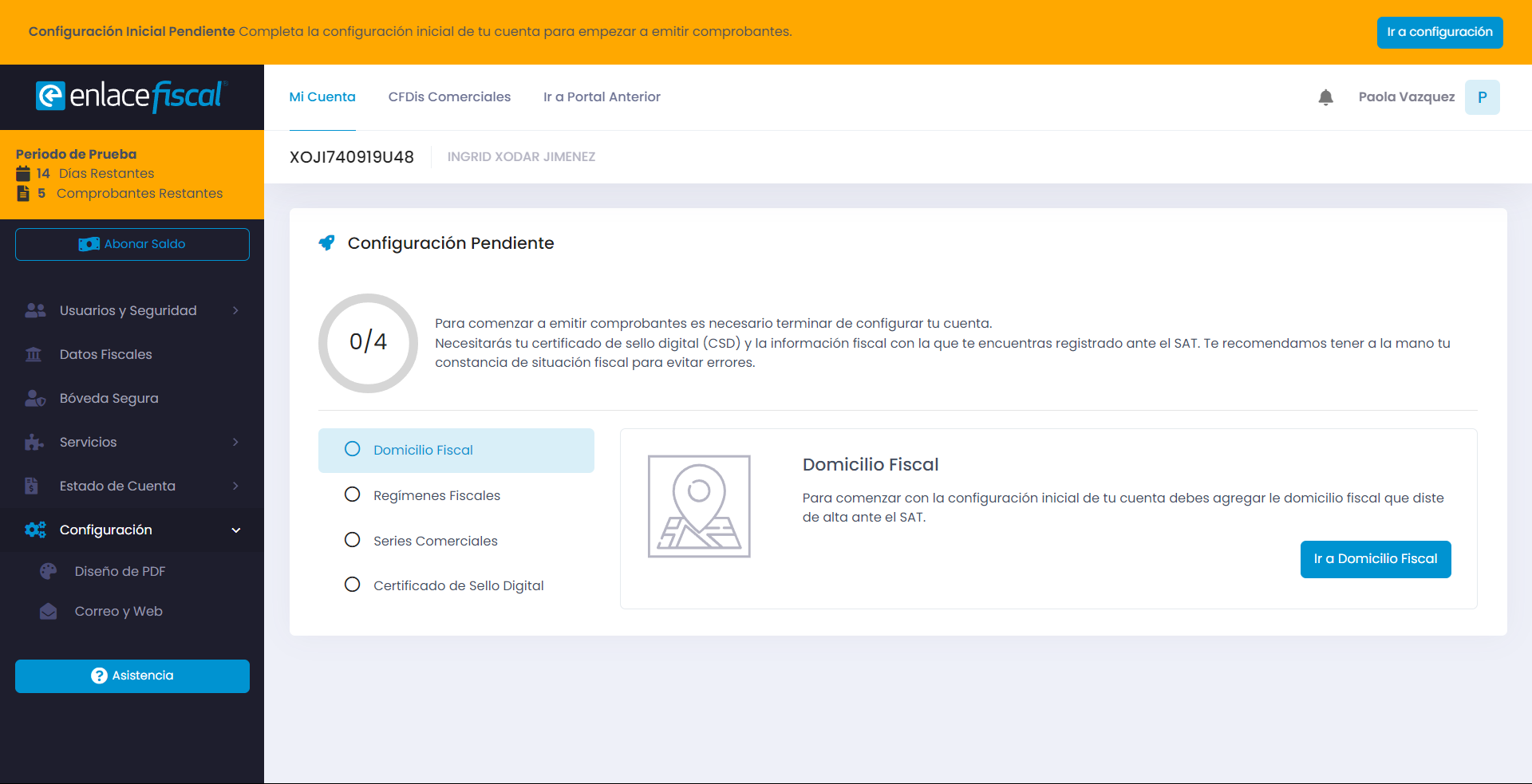Después de activar tu cuenta e iniciar sesión, se presentarán un conjunto de configuraciones esenciales que debes completar antes de empezar a emitir tus comprobantes.