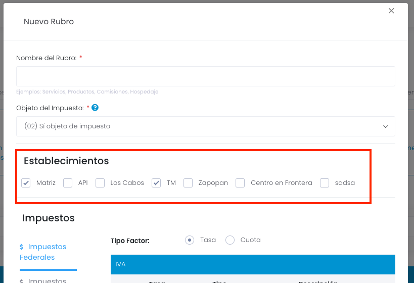 Esto mostrará la ventana de los impuestos relacionados al rubro, Se mostrará los nombres de los nuevos establecimientos y sólo se necesita activar la casilla para que el rubro quede relacionado a los establecimientos.