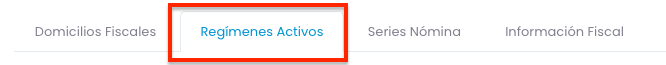 El siguiente paso es agregar el régimen fiscal al que se pertenece, para esto se debe acceder a la pestaña Regímenes Activos.