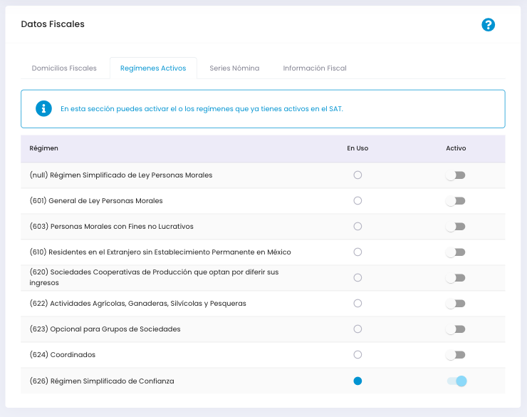 Esto mostrará el listado de regímenes disponibles. Para agregarlos solo se deben activar las casillas que correspondan al régimen.