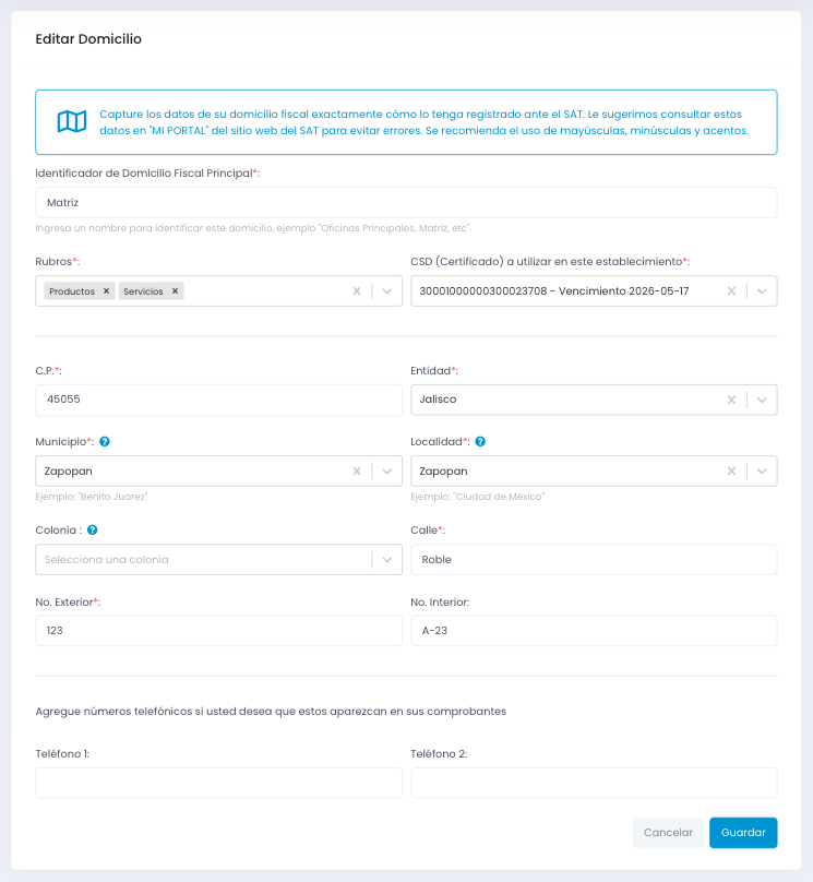 Se ingresa al Alta de Domicilio en la pestaña de Dirección Fiscal y se completa la información como se tenga registrado ante SAT.
