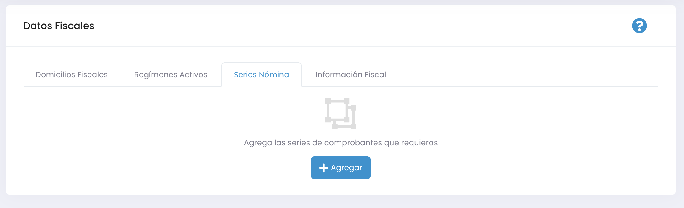 Como segundo paso en la configuración de datos fiscales, se hace click en el botón de Agregar dentro de la pestaña de Series Nómina en el módulo de Datos Fiscales.