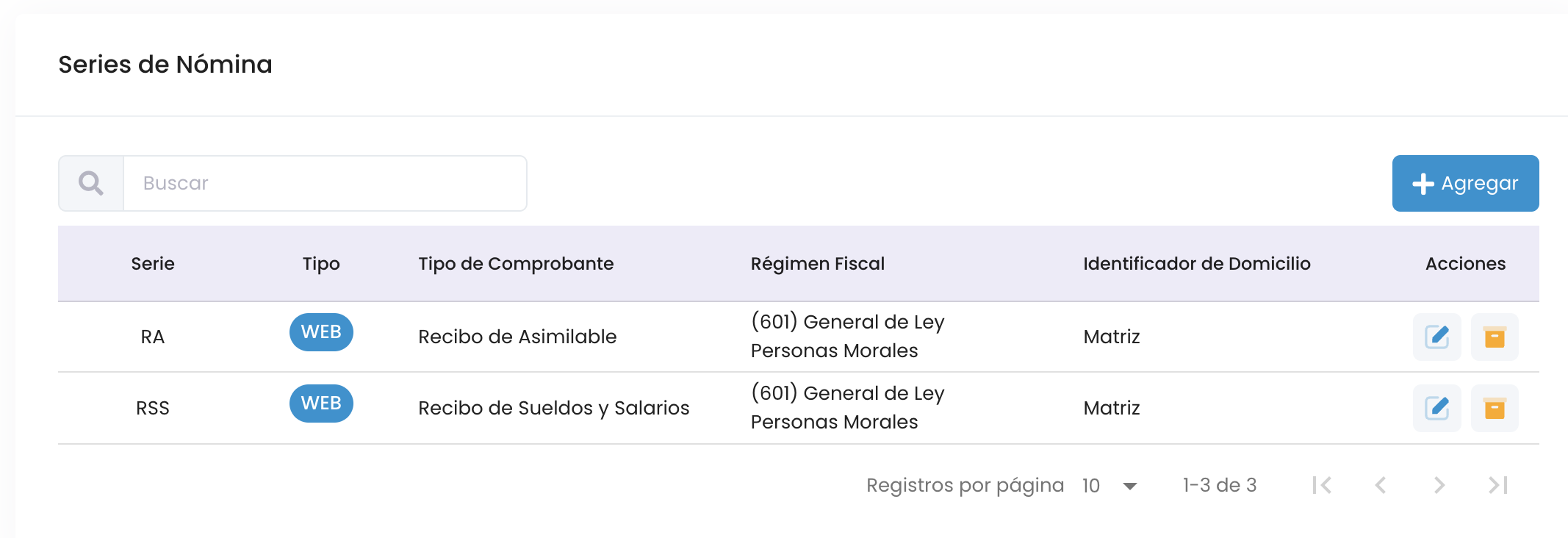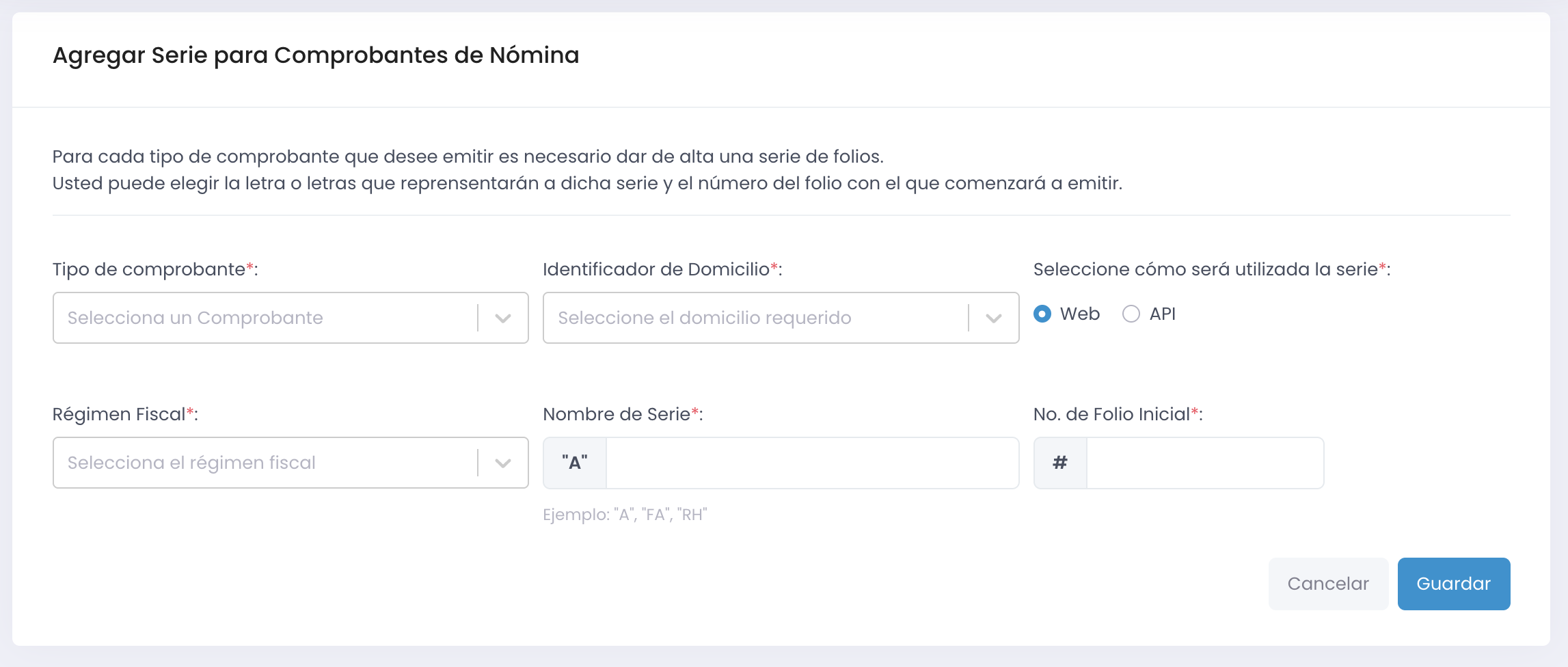 Se define una serie para los comprobantes, recomendamos letras que identifiquen el tipo de comprobante, ejemplo "NOM" para el caso de nóminas, en tipo de comprobante estará la opción Recibo de Sueldos y Salarios para el caso de asalariados, se selecciona el régimen fiscal y el número de folio inicial. Al guardar, el nuevo folio aparecerá en la vista principal de la sección.