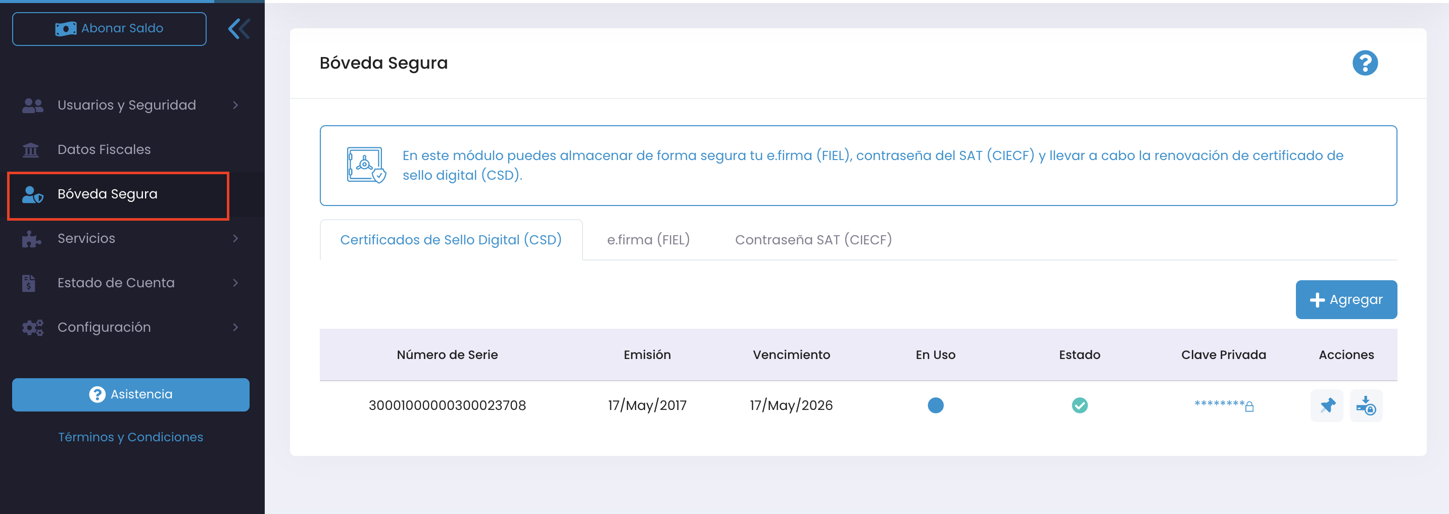 📣 Nota: Los certificados se pueden utilizar en varios servicios, en caso de tener uno agregado, éste puede ser utilizado simultáneamente para nómina.