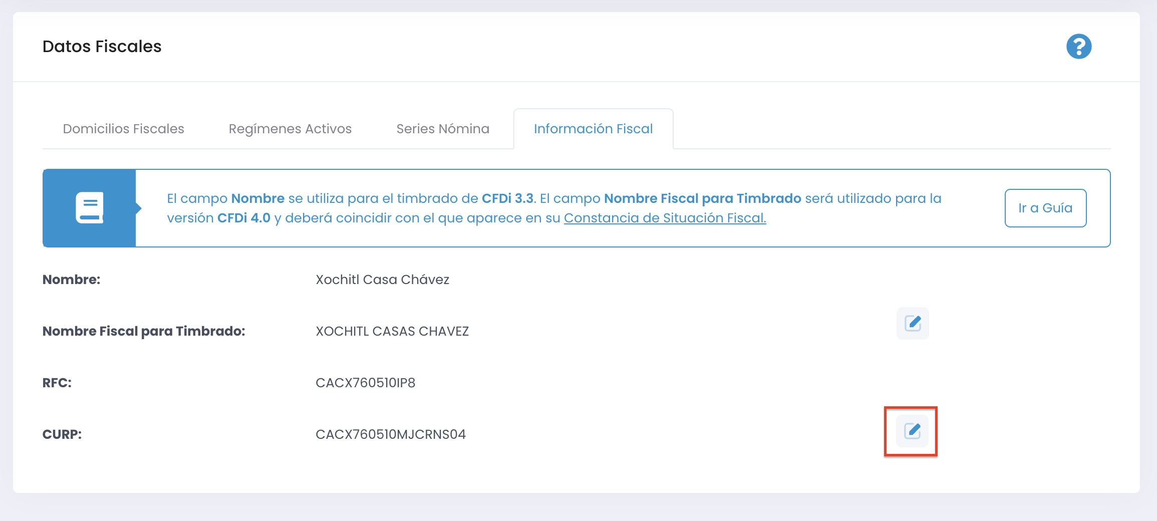 En caso de ser persona física se deberá configurar la CURP en la pestaña Datos Fiscales .