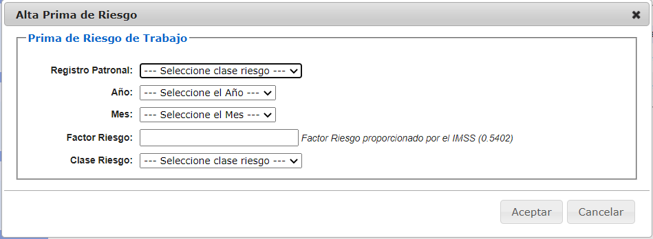 Al ingresar el registro patronal aparecerá la configuración de primas de riesgo. Cuando se inscriben los patrones ante el IMSS o al cambiar de actividad, deben de identificar la prima de riesgos en la cual deben de cotizar, de acuerdo a la actividad o giro de la empresa. Estas mismas clases serán las que se registren en este apartado.