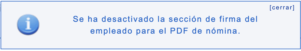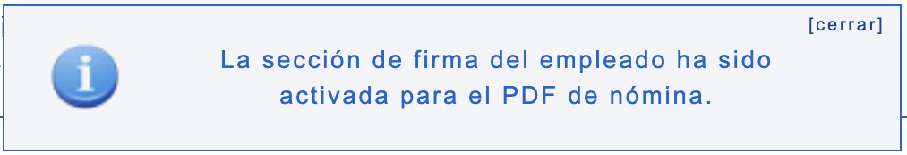 Al activar esta configuración se mostrará un mensaje de confirmación indicando que se ha activado correctamente y a partir de este momento los PDF de nómina mostrarán la sección.
