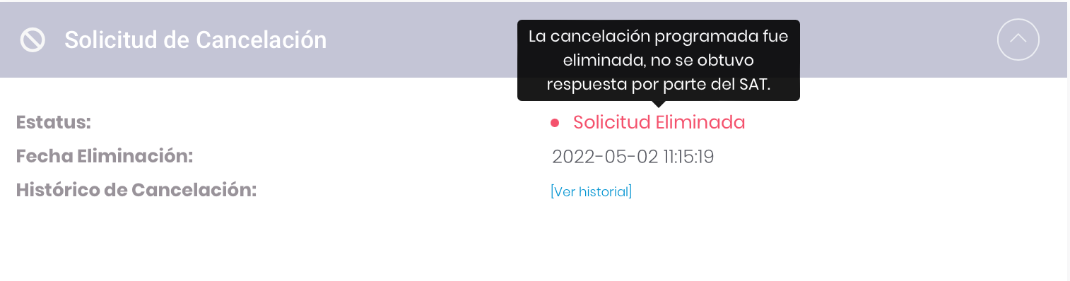 Una solicitud programada se intentará cancelar ante el SAT por hasta 72 horas, en caso de no obtener respuesta por parte del SAT, se eliminará la cancelación programada por lo que ya no se reintentará automáticamente la cancelación, el comprobante seguirá vigente, si así lo requiere es posible volver a solicitar la cancelación del mismo.