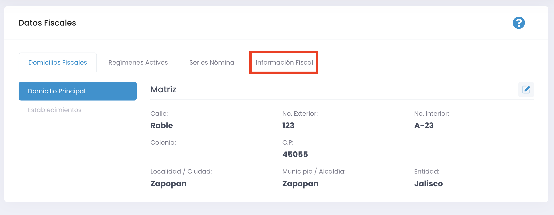 Para corroborar que tu dirección fiscal esté correcta, hay que dar click en la pestaña de Domicilios Fiscales.
