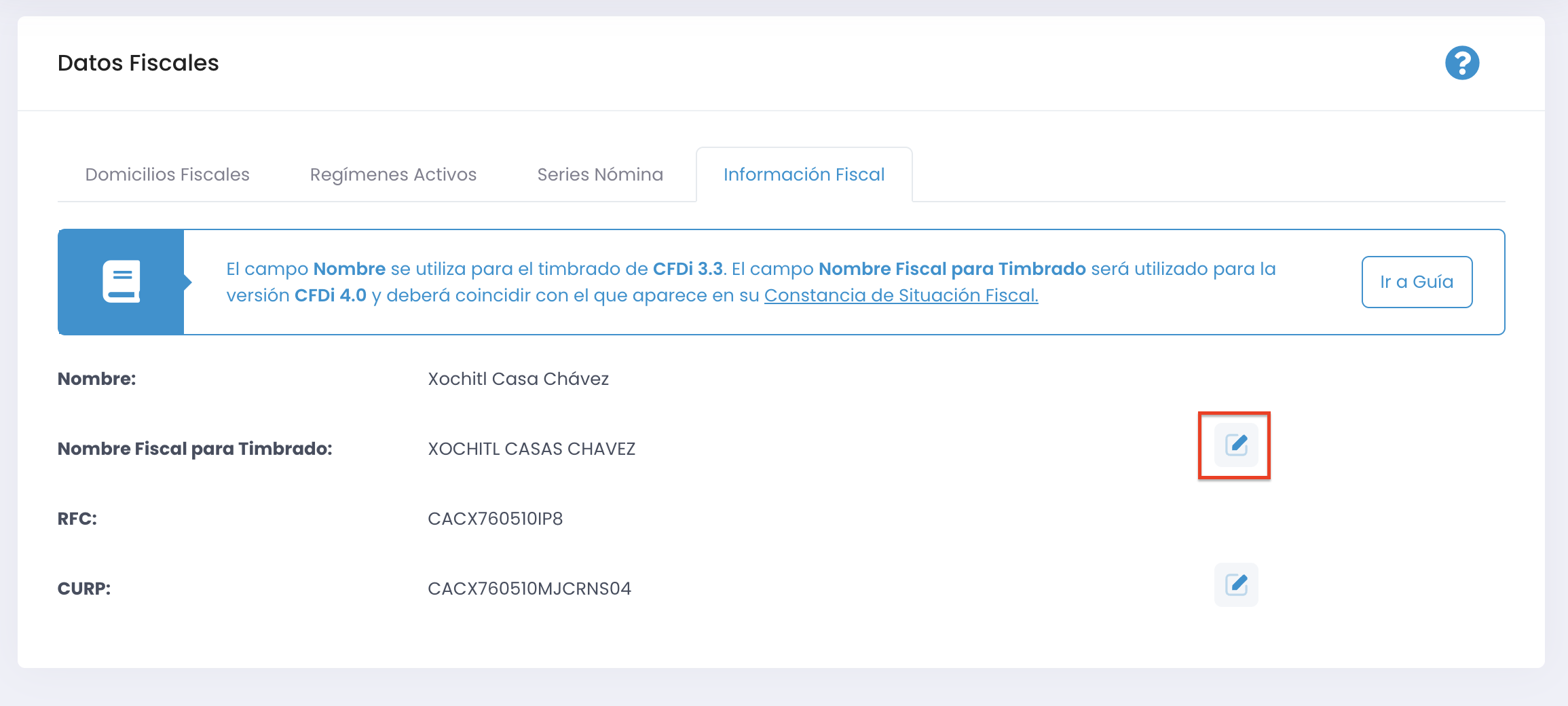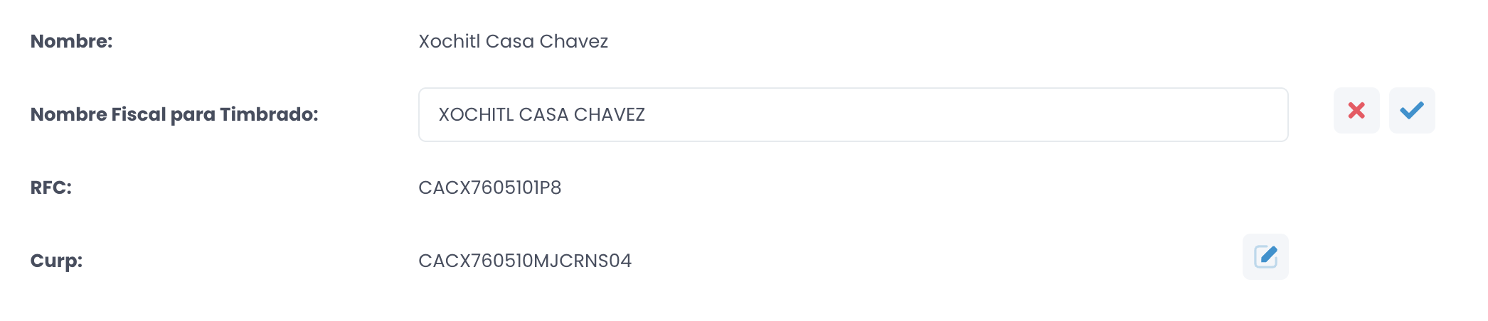 Dependiendo el caso, debes actualizar tu razón social (si eres persona moral) o tu nombre (si eres persona física), exactamente como aparece en tu constancia (respetando mayúsculas y signos de puntuación). Para poder actualizarlo debes hacer click en el botón de edición ubicado del lado derecho del Nombre Fiscal para Timbrado.