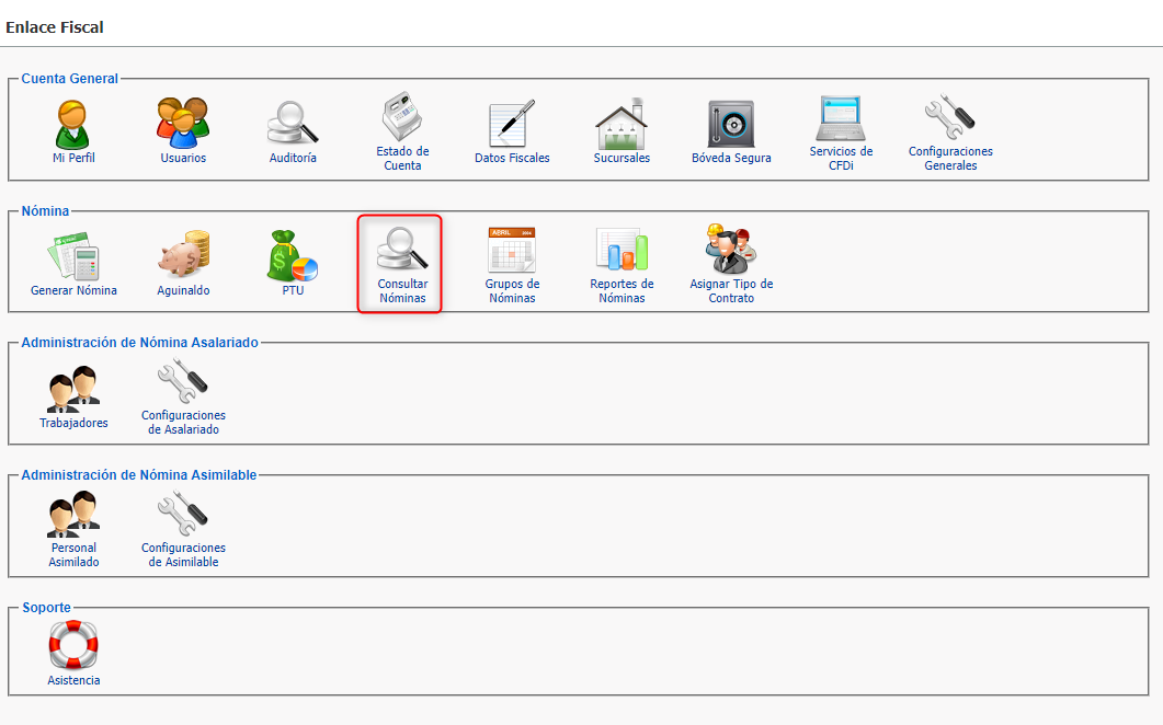 Cuando se cancela la nómina a un trabajador, se suele requerir emitirla correctamente de nuevo. Para poder emitir el recibo de nómina se debe ingresar a Consultar Nómina, se encuentra ubicada en la pantalla de inicio dentro de la sección Nómina.