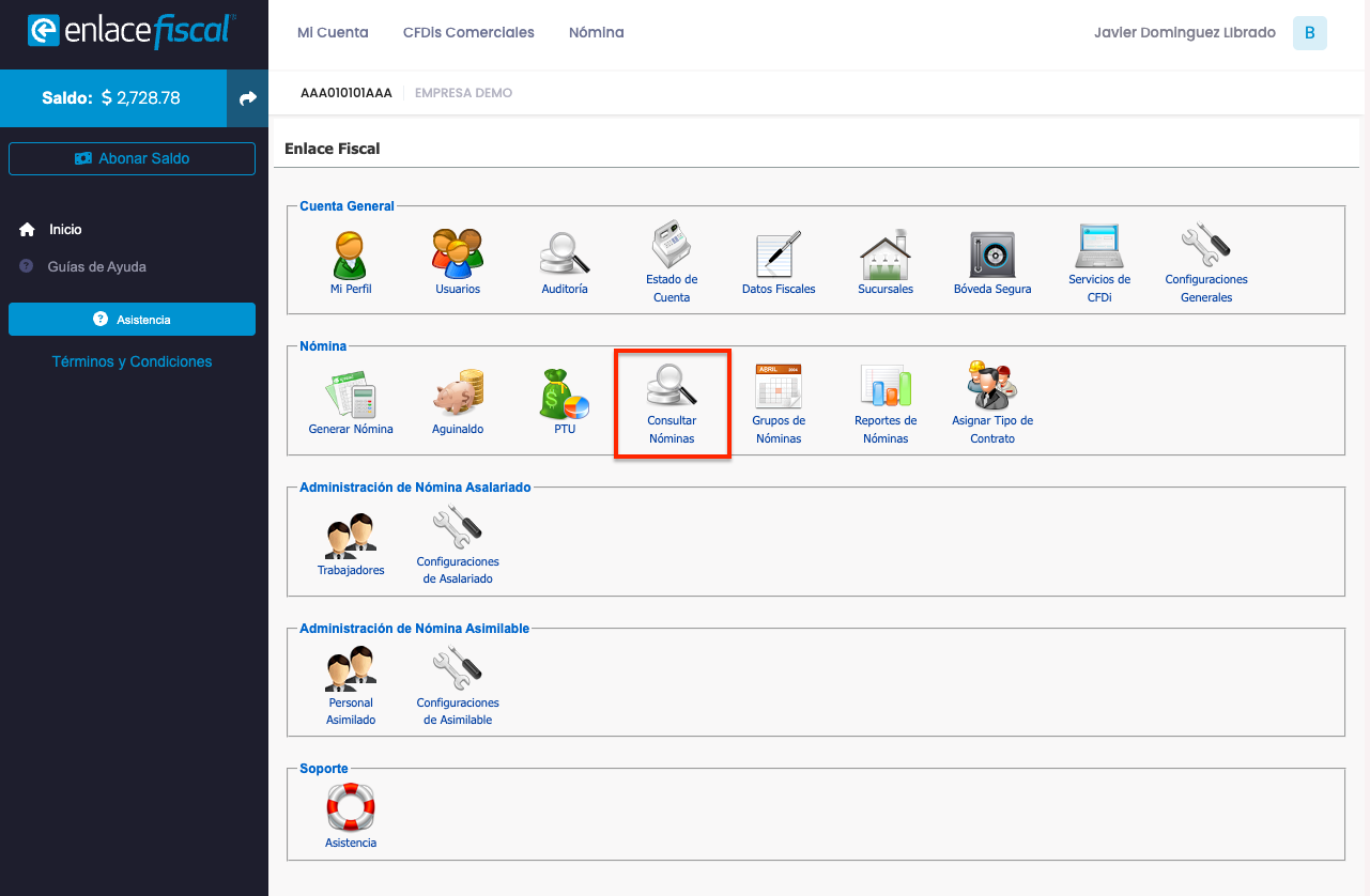 Para comenzar, debes dirigirte al módulo Consultar Nóminas, dentro de la sección Nómina.