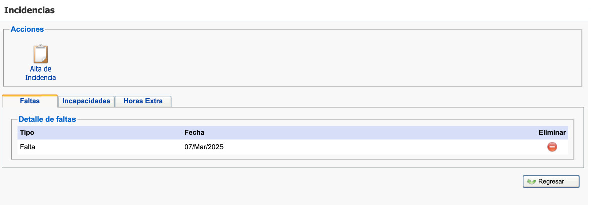 📣 Nota: La incidencia no podrá eliminarse si se encuentra en proceso de nómina.