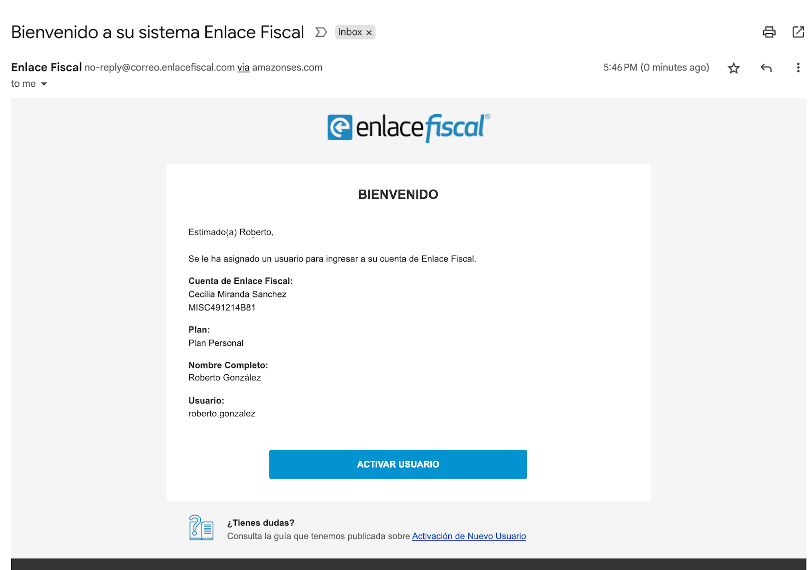 - Haz clic en el botón Activar Usuario en el correo que recibiste por parte de Enlace Fiscal