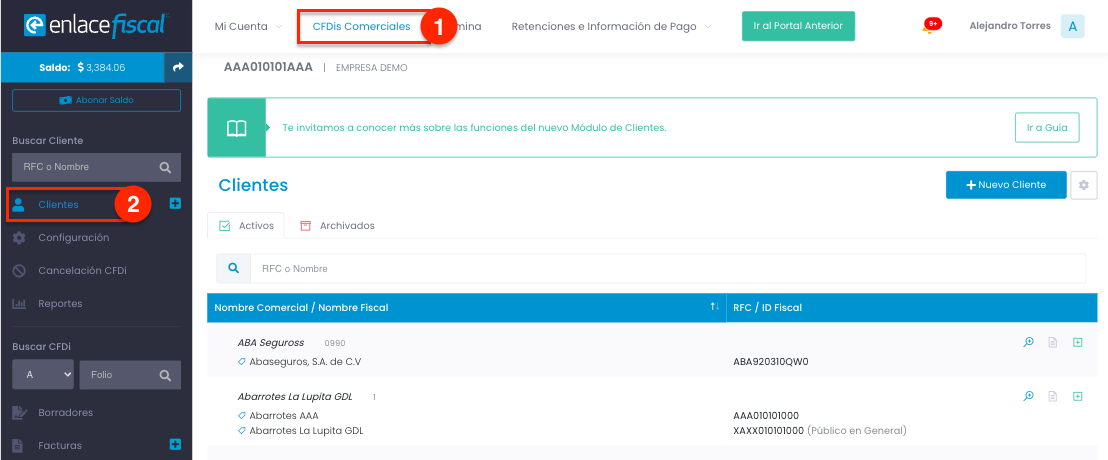Para consultar el estado de cuenta, debes ingresar al módulo de Clientes dentro del apartado CFDi Comerciales.