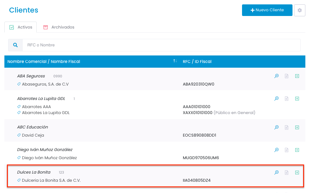Esta opción aparecerá deshabilitada si el cliente sólo cuenta con un RFC registrado.