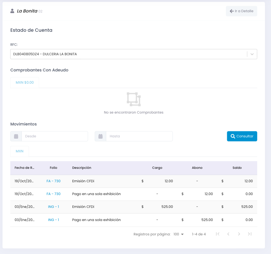 📣 Nota: Si un cliente tiene más de un RFC registrado, se debe seleccionar el RFC que deseas consultar, ya que los movimientos se muestran separados por RFC.
