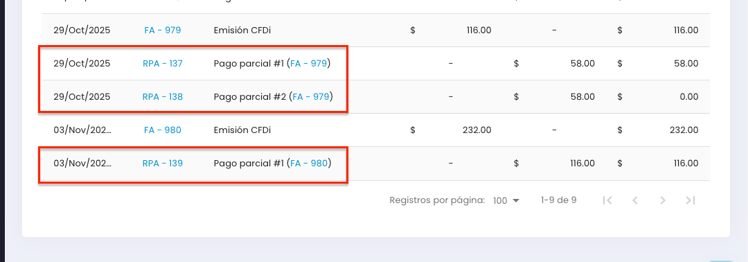 Los pagos realizados mediante REP se muestran de acuerdo con el número de parcialidades registradas al momento de ser emitidos.