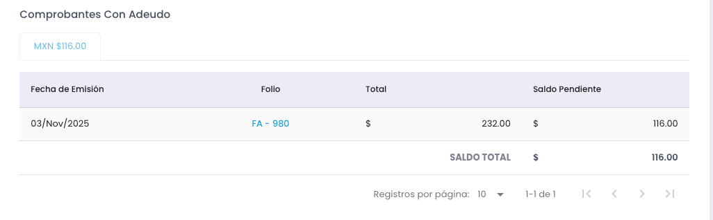En caso de que el cliente tenga adeudos pendientes, por ejemplo facturas PPD sin pago o con pago parcial, el sistema mostrará una sección adicional.