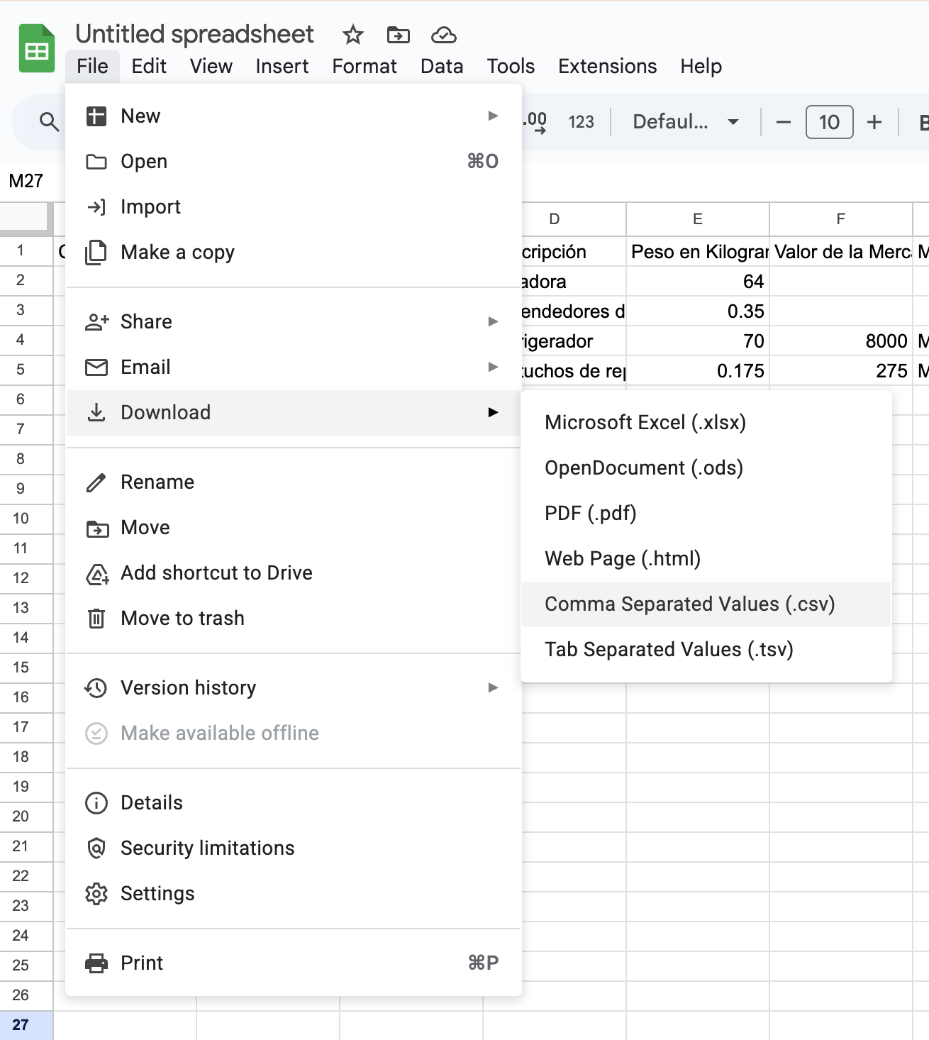 Una vez que hayas completado el llenado del archivo, expórtalo o descárgalo en formato CSV (Valores Separados por Comas).
