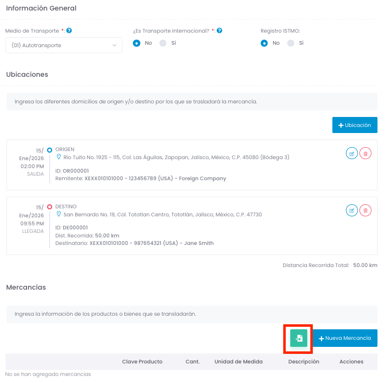 En el apartado de mercancías durante el llenado del complemento Carta Porte, haz clic en el botón verde de carga.