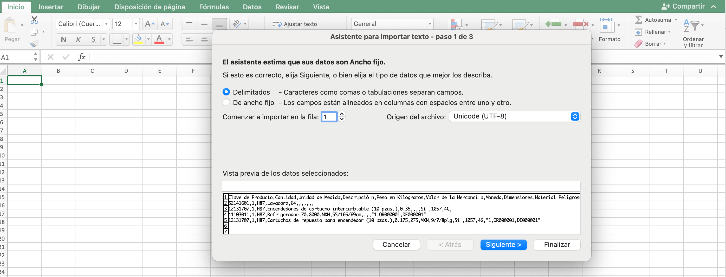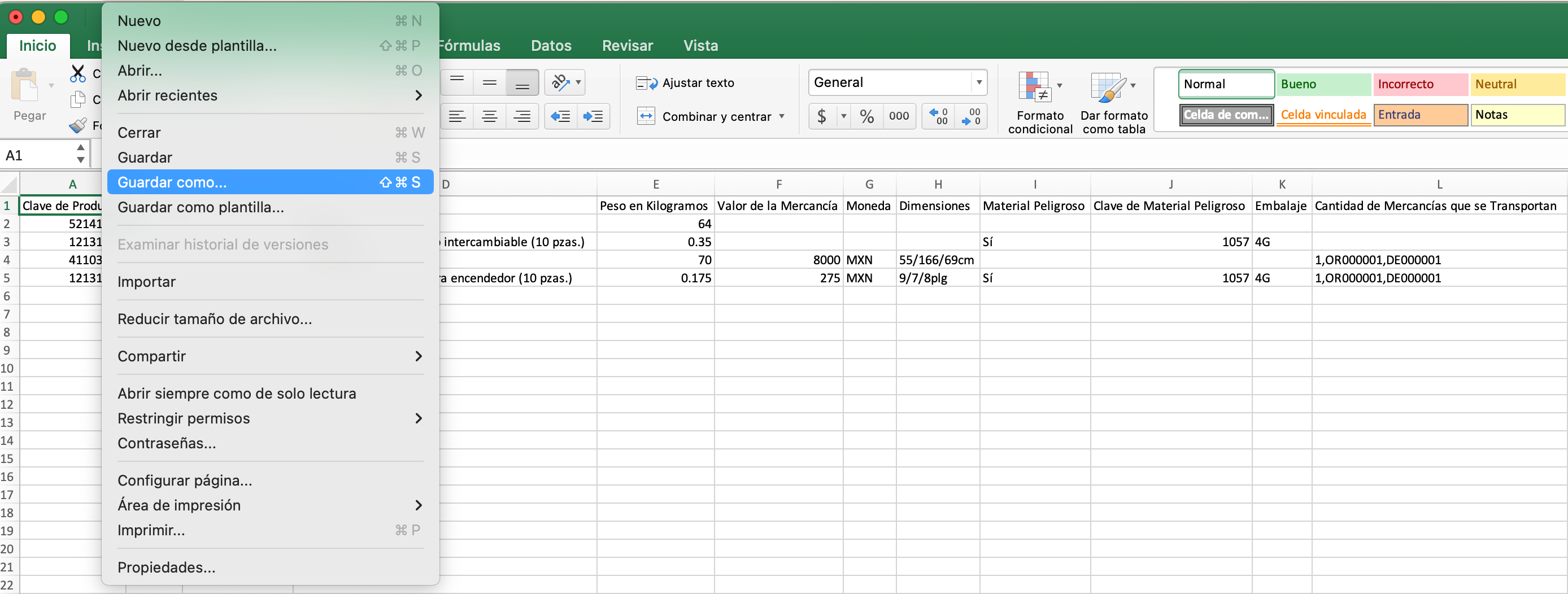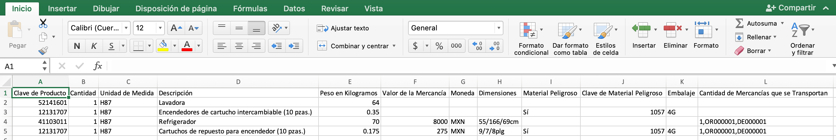 Te recomendamos utilizar estos archivos como plantilla borrando los registros de ejemplo y añadiendo tus mercancías, ya que estos archivos ya cuentan con la codificación UTF-8 que es compatible con acentos y otros caracteres válidos en el CFDi.