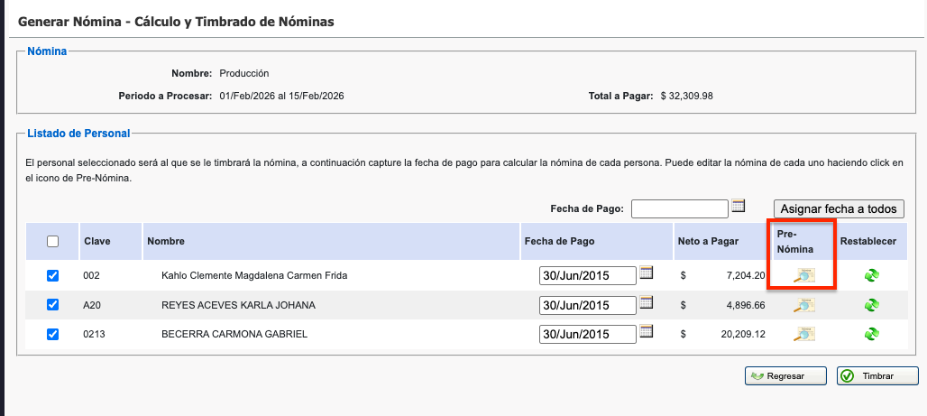 En el paso de Cálculo y timbrado de nóminas, debes ubicar al empleado correspondiente y hacer clic en el icono de pre-nómina. Al seleccionarlo, se abrirá una ventana con el desglose de su nómina, dónde se muestran las secciones de percepciones, deducciones y otros pagos.