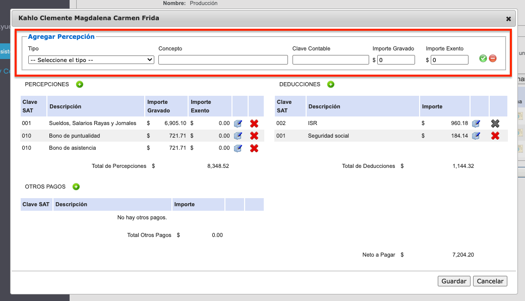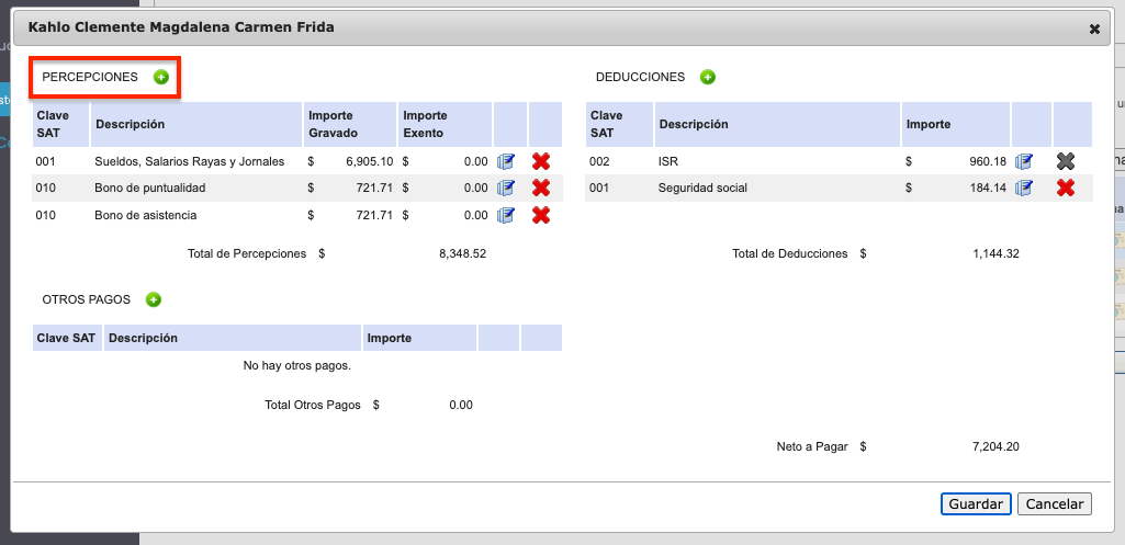 Para agregar una percepción, dentro de su sección correspondientes se debe hacer clic en el botón ➕