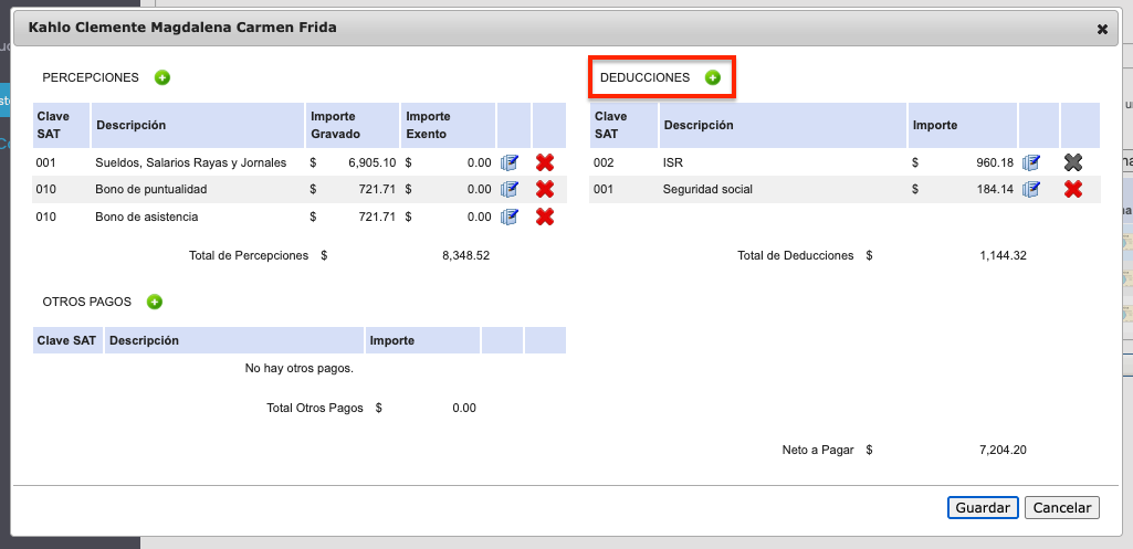 Agregar percepciones y deducciones a nómina