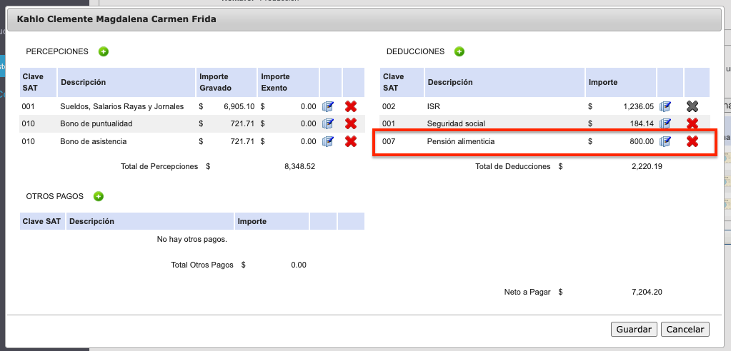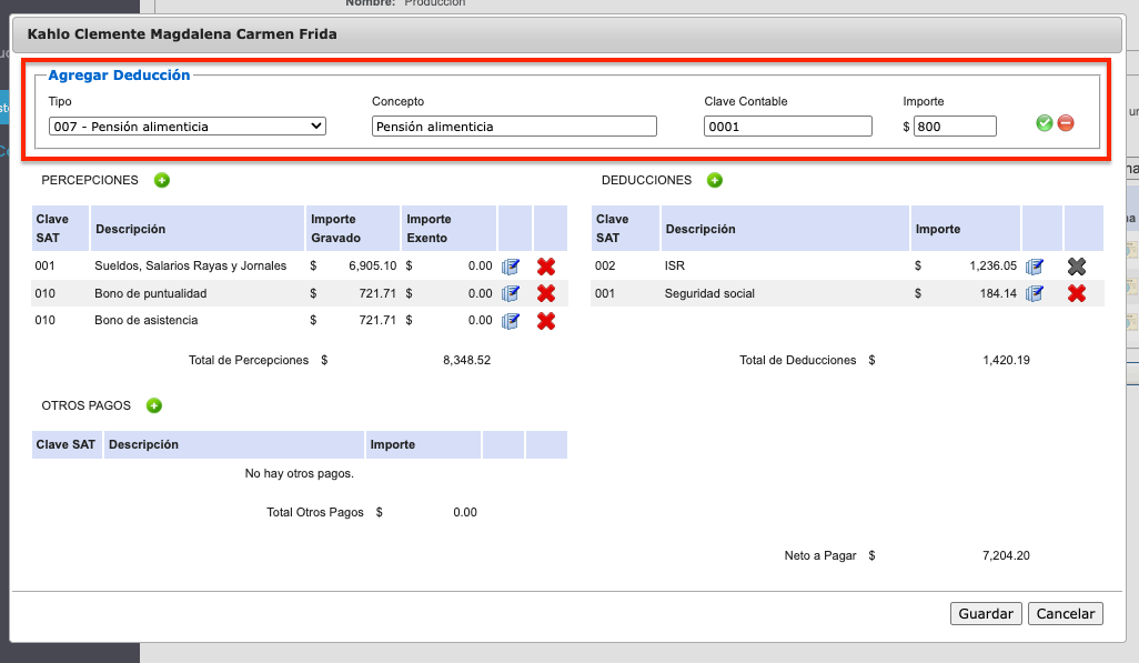 - Tipo de deducción (para este ejemplo 007 Pensión Alimenticia)